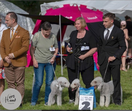 Bedlington Terrier Dorothea Blue Diamond from Switzerland FCI erreichte am 3.9.2023 Vorzüglich V1, CAC, beste CAC Hündin BOB Clubsieger Champion du Club.🥳😊